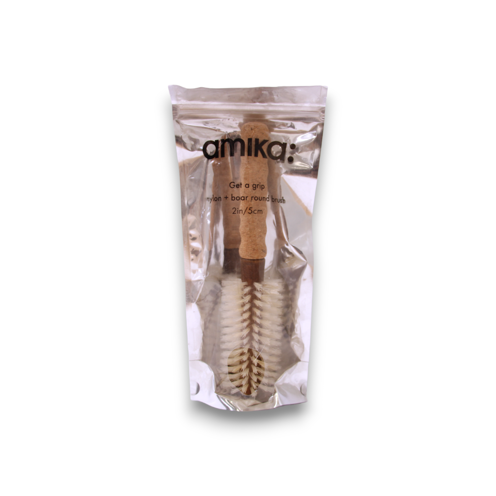 Amika Cork Hair Brush is a grooming tool typically used to detangle, smooth, and style hair. It consists of a handle and a set of bristles, which can be made from a variety of materials such as plastic, nylon, boar bristle, or metal. The bristles are arranged in rows and can vary in length, thickness, and stiffness depending on the intended use and hair type. Hairbrushes can come in different shapes and sizes, ranging from small travel brushes to larger paddle brushes. Some brushes may have a curved or angled shape to help with styling and creating volume. Others may have a cushioned base to provide a more comfortable brushing experience and reduce pulling or tangling. To use a hairbrush, one typically holds the handle and runs the bristles through the hair, starting at the ends and working up towards the roots. The brush can be used to smooth out tangles, distribute natural oils, and style the hair as desired. Overall, a hairbrush is an essential tool for maintaining healthy, beautiful hair and can be found in most households and hair salons.